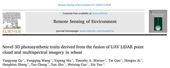 《Remote Sensing of Environment》发表智慧农业团队“Novel 3D photosynthetic traits derived from the fusion of UAV LiDAR point cloud and multispectral imagery in wheat”