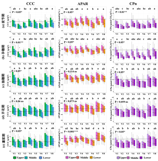 基于数字表面模型方法,将无人机平台的LiDAR点云与多光谱影像反射率进行融合,量化了小麦的三维光合性状。结果表明,融合光谱信息后的点云能够准确表征不同条件下的小麦光合参数三维空间分布(图1)。小麦冠层不同层(上层、中层和下层)之间的光合性状具有显著差异性(p < 0.05)(图2)。