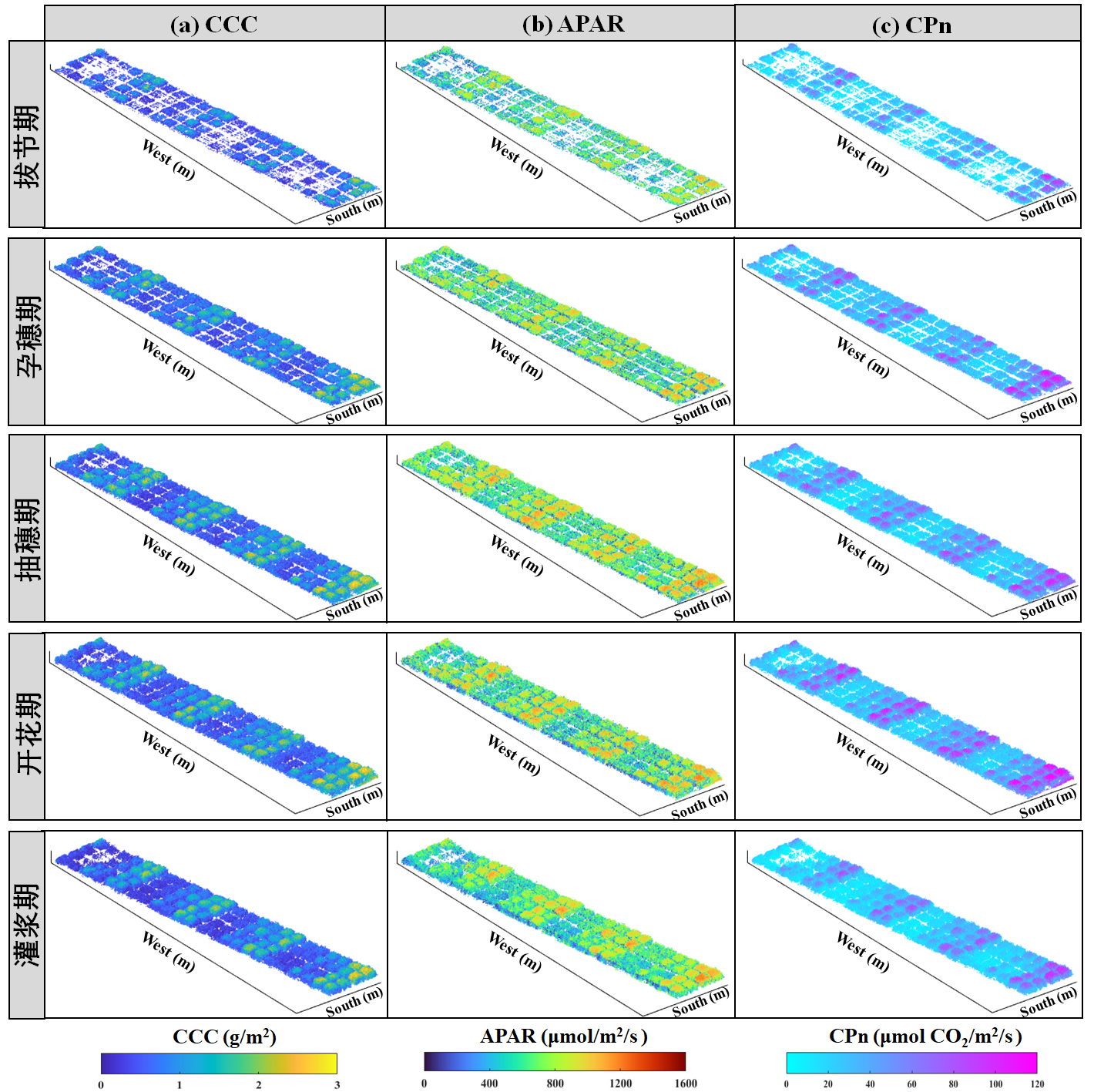图1 小麦不同生育期的小麦光合参数三维空间分布