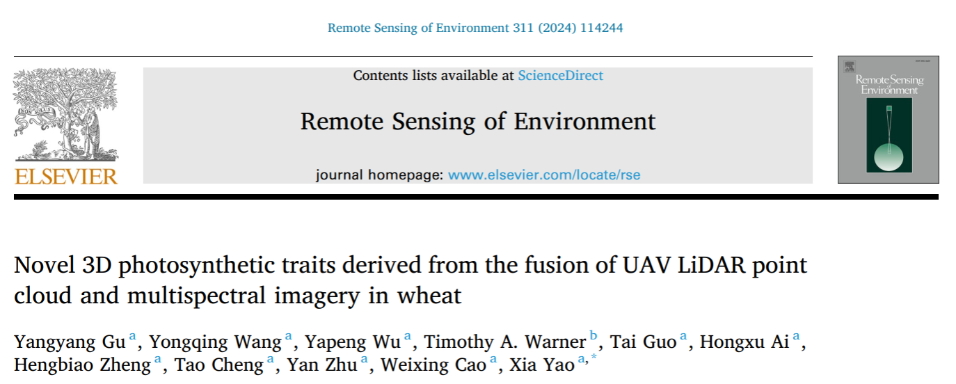 《Remote Sensing of Environment》发表智慧农业团队“Novel 3D photosynthetic traits derived from the fusion of UAV LiDAR point cloud and multispectral imagery in wheat”