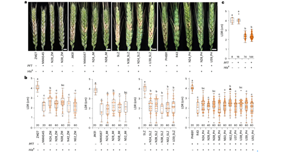 为了进一步阐明Fhb1位点抗赤霉病的机制,该研究团队在前期克隆HisR的基础上,利用11个携带不同HisR转基因事件的株系和Fhb1近等基因系,在12个遗传背景中创制了109个携带HisR和PFT 不同等位基因的导入系,并进行抗赤霉病鉴定。他们发现,无论是携带HisR的近等基因系还是携带HisR转基因的导入系,赤霉病抗性都显著增强,且与HisR的来源无关。该团队进一步比较了四个遗传背景中携带和不携带PFT 的HisR导入系的赤霉病抗性,结果表明所有HisR导入系的赤霉病抗性都不受PFT 存在与否的影响(图1a,b)。根据PFT 和HisR的有无进行所有遗传背景的合并比较,也得出相同结论(图1c)。