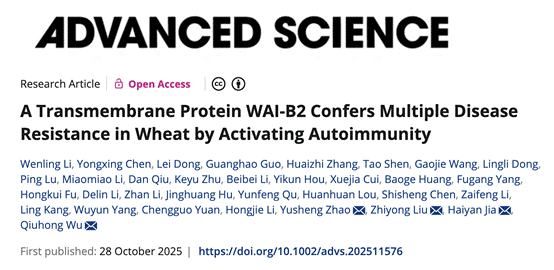 论文链接:Li W., Chen Y., Dong L., et al. (2025) A transmembrane protein WAI-B2 confers multiple disease resistance in wheat by activating autoimmunity. Advanced Science e11576. //doi.org/10.1002/advs.202511576