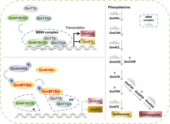 图1 GmMAPK6-GmMYB4-MBW在调节大豆异黄酮含量中的作用模型