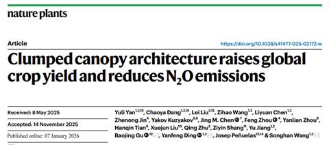 《Nature Plants》发表丁艳锋教授团队“Clumped canopy architecture raises global crop yield and reduces N2O emissions”