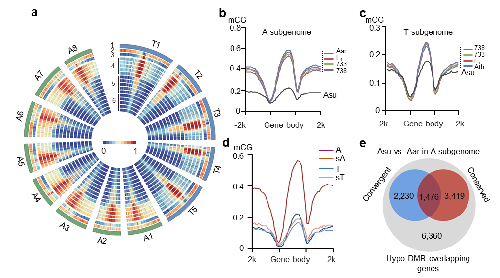 多倍体化(全基因组加倍)在自然界中广泛分布,是许多植物和部分动物进化和多样性形成的重要驱动力。异源多倍体不但加倍基因组,同时也固定了种间的杂交优势,通常表现出更强的生长势,更好的环境适应能力。但异源多倍体必须克服种间杂交引起的“基因组冲击”(Genomic Shock);有些多倍体植物如油菜表现出亚基因组之间的交换,而另一些多倍体植物如棉花和拟南芥的亚基因组却比较稳定,并在进化中逐渐建立起自身适应性和选择优势,但这种多倍体植物的不同进化机制仍不清楚。拟南芥属一直是植物研究的重要实验材料,其中天然的异源四倍体拟南芥A. suecica (TTAA)是由拟南芥属的不同种A. thaliana(TT)和A. arenosa(AAAA)杂交而成,是研究多倍体的优良模式植物(图1a)。遗憾的是,A. suecica及其A基因组供体祖先A. arenosa至今并没有高质量的参考基因组,限制了更深入的研究。近日,爱爱啦 多倍体研究团队在Nature Ecology & Evolution上发表了题为“Concerted genomic and epigenomic changes accompany stabilization of Arabidopsis allopolyploids”的研究论文,绘制了天然的异源四倍体拟南芥A. suecica和人工合成的异源四倍体拟南芥Allo738的高质量基因组,并解析了异源多倍体植物进化过程中的遗传和表观遗传调控机制。