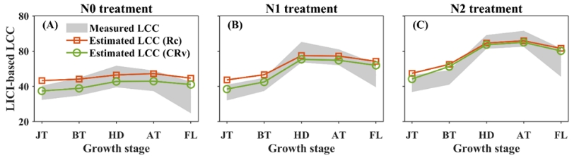 应用3SV算法前后小麦LCC估算值和实测值的季节变化趋势比较