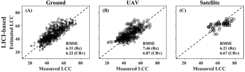 该研究利用地面、无人机和卫星平台获取的作物与其他植被类型实测数据,验证了3SV算法在消除土壤影响和提高LCC估算精度方面的能力。结合LICI和3SV算法,作物数据集LCC的估算误差为6.22 µg/cm2,多物种数据集LCC的估算误差最低为10.40µg/cm2,明显低于消除土壤背景前的估算误差(14.26 µg/cm2)。同时,本研究采用的LCC半经验估算模型由辐射传输模型模拟数据集得到,综合了机理模型的通用性和经验模型的实用性,建模过程不需要实测数据,具有很好的普适性,适用于多种植被类型的LCC估算。该研究系统评估了土壤背景对LCC光谱估算的影响机制,巧妙地融合了3SV算法和基于LICI的半经验模型,对于叶片叶绿素含量全球遥感产品研制和高通量智能化监测具有重要价值。
