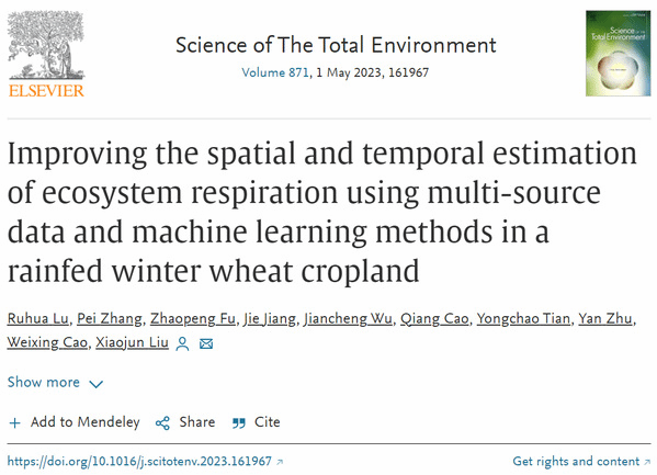 《Science of The Total Environment》发表智慧农业团队“Improving the spatial and temporal estimation of ecosystem respiration using multi-source data and machine learning methods in a rainfed winter wheat cropland”