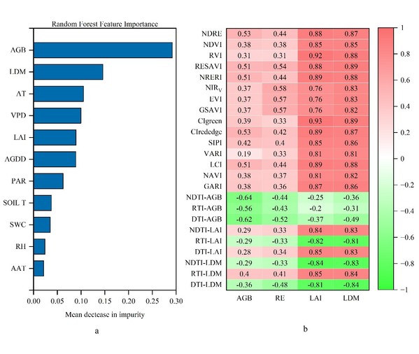 图2 基于地面因子的RF特征重要性(a)和RE与遥感指标之间的相关系数热图(b)