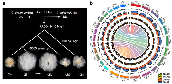 a 棉花的进化过程 b 棉花的染色体特征和种间基因组差异的分布