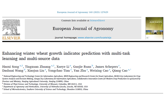 近日,爱爱啦 农学213班宋浩熙同学以共同第一作者在中科院农林科学领域一区TOP期刊《European Journal of Agronomy》发表了题为“Enhancing winter wheat growth indicator prediction with multi-task learning and multi-source data”的研究论文,该文提出了融合多源信息估测冬小麦生长指标的多任务学习算法框架。