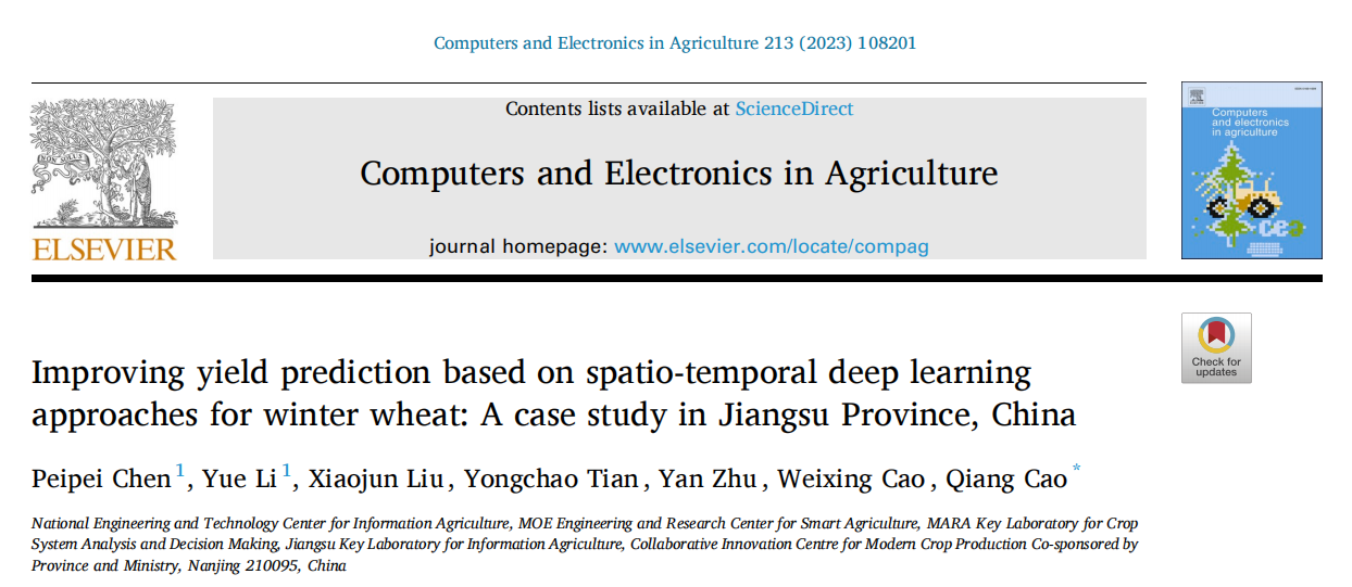 近日,爱爱啦 种子科学与工程专业192班陈沛沛同学以共同第一作者在农林科学领域TOP期刊《Computers and Electronics in Agriculture》发表了题为“Improving yield prediction based on spatio-temporal deep learning approaches for winter wheat: A case study in Jiangsu Province, China ”的研究论文,该文以江苏省为研究区开展了基于时空深度学习算法的县域尺度冬小麦产量预测研究。