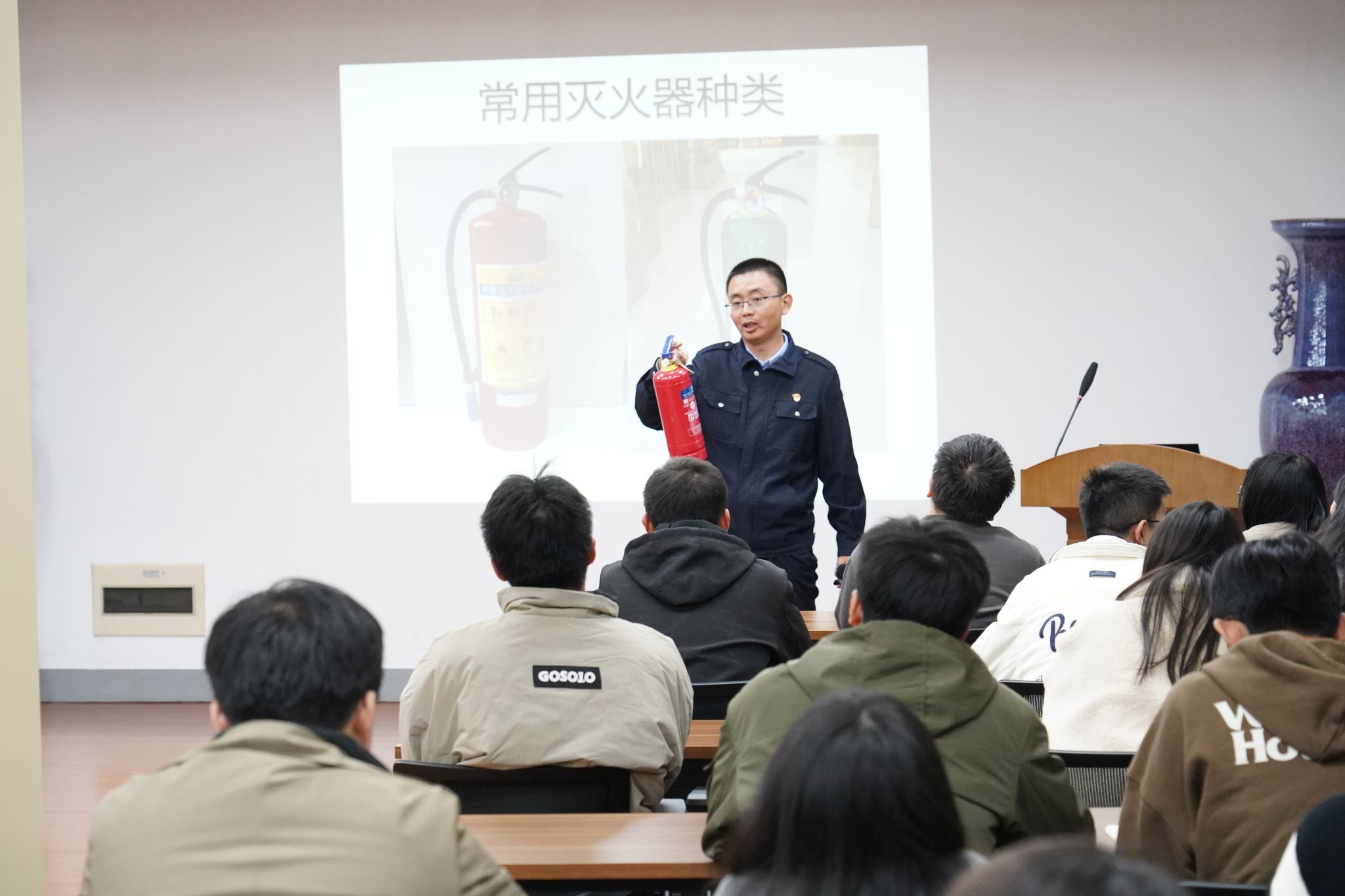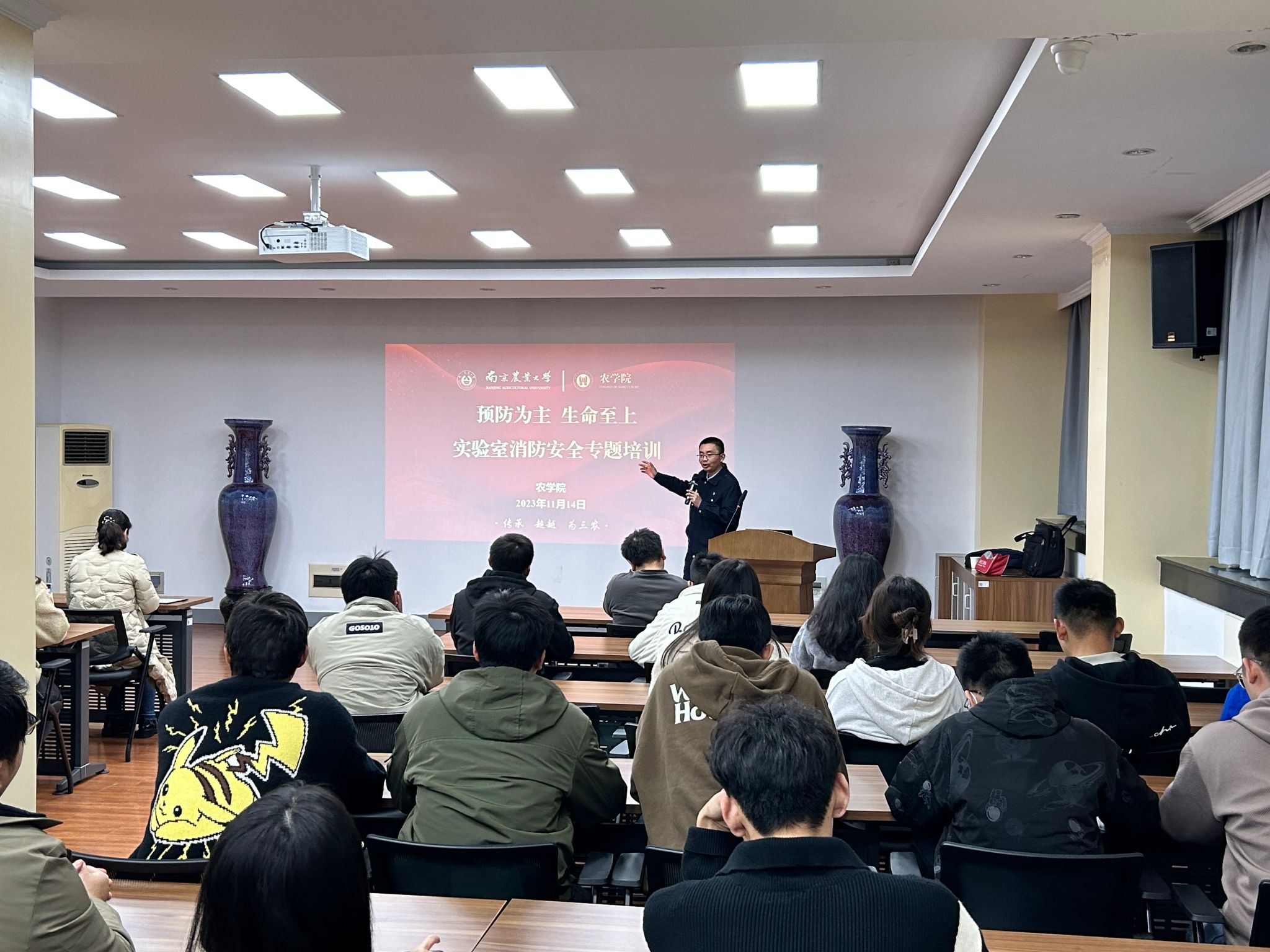 会后,在生科楼E1001举办了消防安全培训讲座。南京安民消防高级教员王虎老师作主题报告。他结合各类消防安全的案例,为同学们讲解了各类消防法规和注意事项。他将消防安全知识融入案例,理论结合实战,讲解通俗易懂,进一步增强了同学们的安全意识和防范能力。