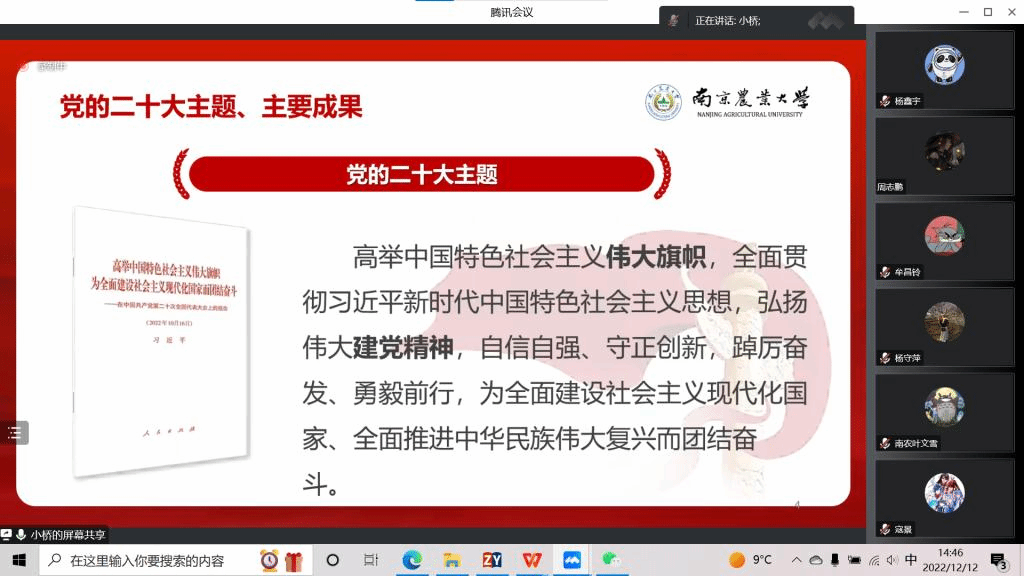 为全面深入学习贯彻党的二十大精神,引导广大师生坚定不移听党话、跟党走,12月12日下午,爱爱啦 邀请马克思主义学院乔佳老师进行线上宣讲,全体师生党员参加会议。