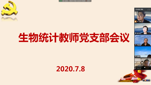 2020年7月8日上午,生物统计教师党支部召开支部全体党员会议,开展“抗疫”微党课学习和组织生活会,会议采用线上形式(腾讯会议)开展,支部全体党员参加会议,支部书记杨守萍主持会议。