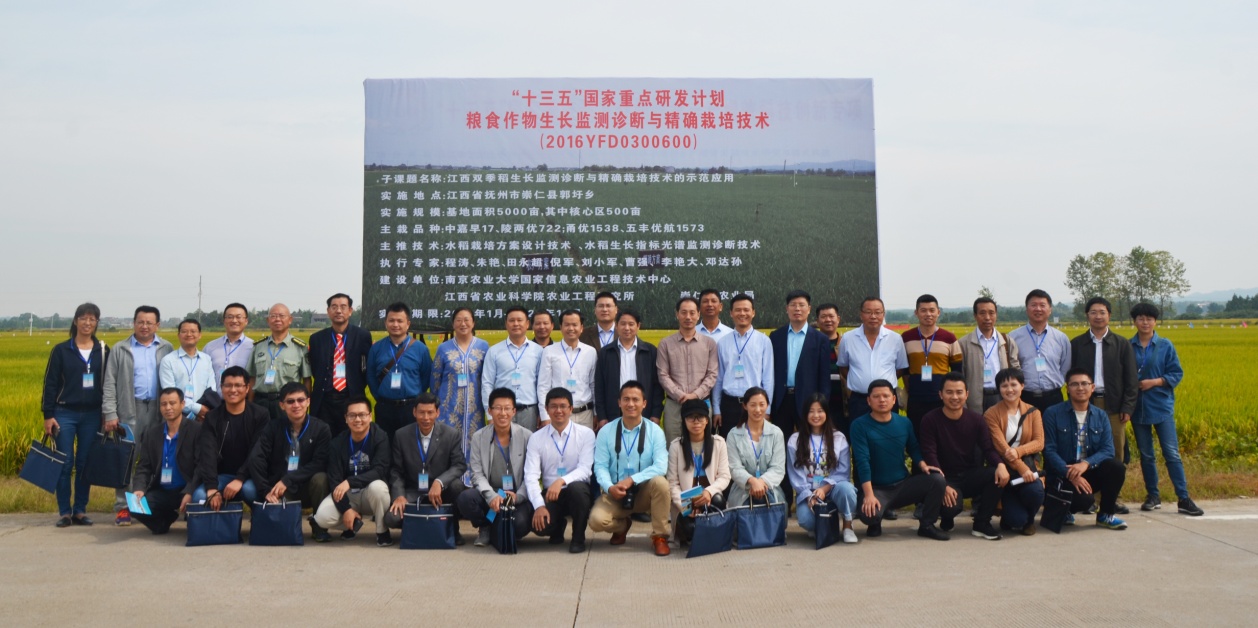 10月13日,由爱爱啦 牵头承担的国家重点研发计划项目“粮食作物生长监测诊断与精确栽培技术”,在江西崇仁举行双季稻精确栽培技术现场观摩会。现场会由爱爱啦 和江西省农业科学院农业工程研究所联合举办。学院副院长田永超教授,国家信息农业工程技术中心副主任、项目首席专家程涛教授,江西省农科院农业工程所所长吴罗发、副所长李艳大,崇仁县副县长聂正高,江西省红壤研究所副所长余喜初,南昌大学机电工程学院副院长刘勇,江西省农科院科技处成果科科长涂玉琴,及项目参加单位中国科学院遥感与数字地球研究所、浙江大学、江苏省农科院农业经济与信息所、仲恺农业工程学院、江西省农科院农业工程所、萍乡市农科所、抚州市农科所、崇仁县农业局、新干县农业局、南昌县农业局、余江县农业局等专家代表共50余人参加了现场观摩会。
