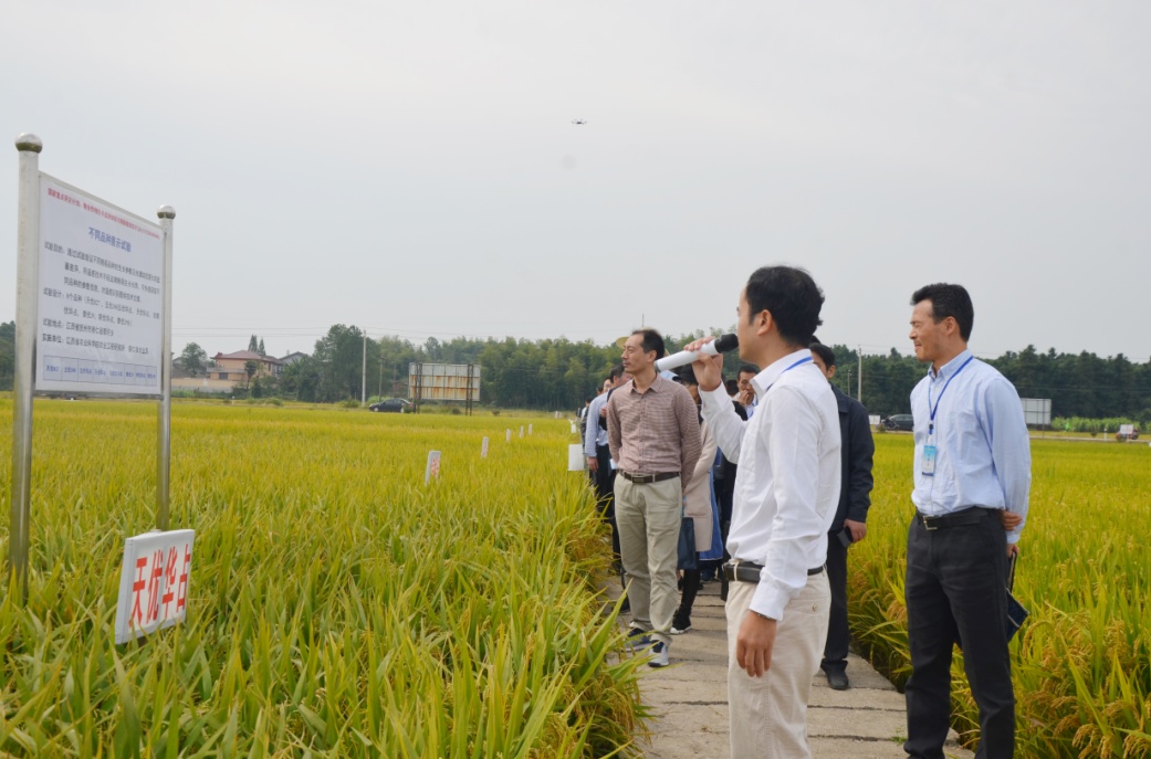 在崇仁县郭圩乡试验示范基地,李艳大向参会人员详细介绍了水稻精确栽培技术示范基地的建设情况。随后介绍了用于示范技术和产品测试与本地化的多个试验,主要包括不同品种与氮肥互作试验、不同施氮水平试验、不同品种展示试验及其监测诊断等,为示范区的诊断调控技术提供参数和模型支撑。