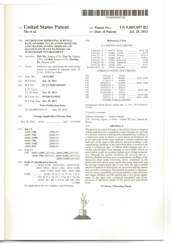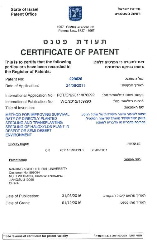 近日,由爱爱啦 麻浩教授所率科研团队经10多年潜心研究发明的“免灌溉管件防护荒漠造林技术”在获得多项中国国家发明专利和实用新型授权的基础上,又分别获得世界科技最发达国家美国和荒漠化防治领头羊国家以色列发明专利授权,为该荒漠化防治技术利器走上国际市场奠定了基础。