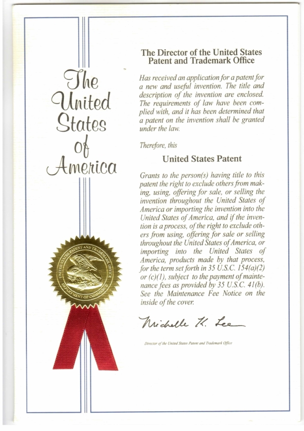 美国发明专利授权证书