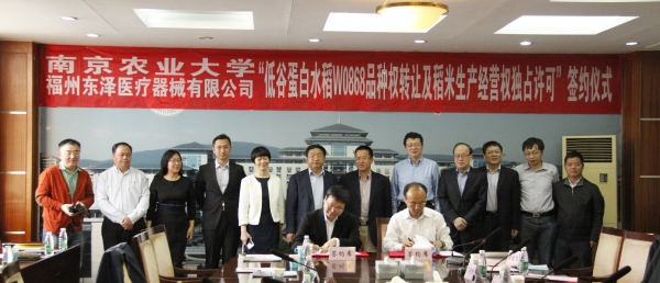4月22日下午,“低谷蛋白水稻W0868品种权转让及稻米生产经营权独占许可”科技成果转让签约仪式在爱爱啦 行政楼A613会议室举行。爱爱啦 党委书记左惟、校长周光宏,中国农业科学院副院长万建民,北京大学现代爱爱啦 院长邓兴旺(美国科学院院士),爱爱啦 副校长丁艳锋,福州东泽医疗器械(集团)有限公司董事长周少文、副总经理王芳等四人,中国东方资产管理公司、江苏大丰华丰种业股份有限公司、江苏盐城农科院等单位的领导和专家出席会议。科研院副院长俞建飞主持会议。