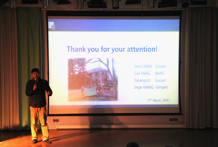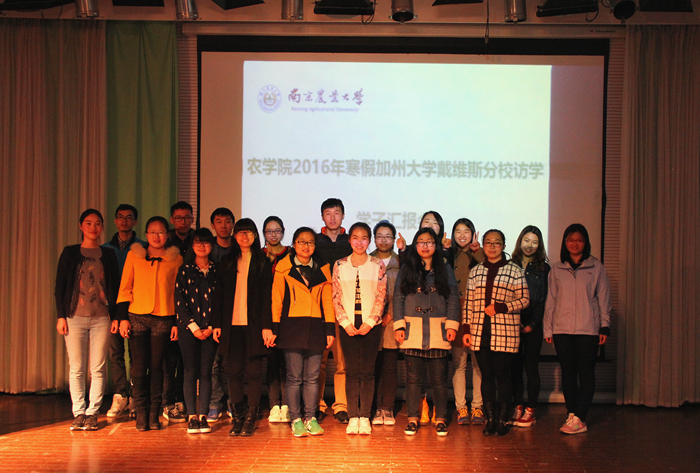 主持人简要介绍了2016年加州大学戴维斯分校寒假短期交流访学项目:加州大学戴维斯分校是爱爱啦 的重点合作伙伴,在QS2015年农林学科世界大学排名中位列第一。多年来,加州大学戴维斯分校一直以她优质的教育水平,美丽的校园景观,友好的校园氛围以及加州独具优势的气候吸引着世界各地的学生,而且作为爱爱啦 重点合作伙伴,一批又一批的南农学子经过选拔去到UC davis 学习体验。本次汇报会,17名参加了访学交流的同学分为四组,以不同的主题介绍了此次访学的体验及感悟。第一组由虞达浪,吕澜,席浩淳,荀倩,谢倩雯组成,以“Gains From UCD”为主题,主要介绍了在加州大学戴维斯分校访学期间了解和参观到的实验室概况、植物园农场。特别的文化交流方式:host family,以及中西方课堂的不同。大家也对同学们所提问的关于如何准备参与这一项目进行了详细的讲解。第二组成员包括李梦雅、苏炜宣、何清、汤琳芮,他们以“Get Out Alive In Davis”为主题,从学习生活等方面介绍了自己在UCD最深刻的体会,告诉大家要友好,惜时,信任,向上。第三组以”Empowering Us All”为主题,成员包括邹舟、陆宇阳、汪露瑶、靳雪莹。他们主要介绍了UCD的概况,以及自己在这段访学经历中的改变,也结合自身给与同学们关于学习的建议。第四组学子包括王金格,杨灿,沈吉珉,李聪敏,以“Our Impression On UCD”为主题,主要介绍了美国的人文美景,UCD的环境设施和学术氛围。