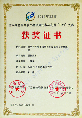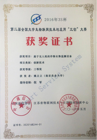 5月18日,第二届“3S杯”全国大学生物联网技术与应用“三创”大赛决赛结果在2016年全国物联网技术与应用大会暨ICT创新创业主题论坛上揭晓。爱爱啦 共有两支队伍参赛,由朱艳教授指导的高珍冉、赵锡泽、孟琦翰团队参赛作品《物联网环境下的稻田水分感知与智慧灌溉》荣获创新技术类一等奖;倪军副教授指导的姚立立、李白琳、邰秀祥团队参赛作品《基于无人机的作物长势监测设备》荣获创新技术类三等奖。