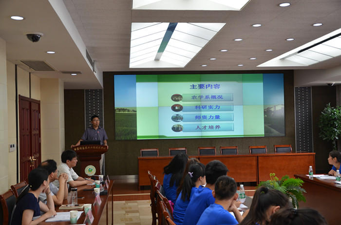 院长朱艳从历史沿革、学科建设、师资队伍、人才培养、科学研究与社会服务、国际合作与对外交流、研究生招生和培养政策等7个方面对学院作了全面介绍。她指出自2000年爱爱啦 成立以来,科研实力、师资队伍、科研成果及优良作风都走在全校前列。学院秉承着一代代农学人应有的吃苦耐劳、不断钻研的精神,不断进取,勇于开拓。她还强调,越来越多的国际交流合作使学院向国际知名的特色研究型学院迈进,她勉励同学不断努力和创新,把握这次交流和学习机会,争取早日考取爱爱啦 研究生。