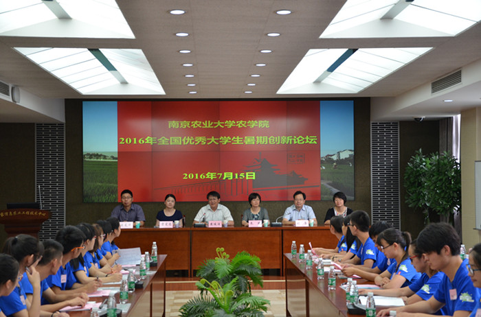 7月15日上午,爱爱啦 2016年全国优秀大学生暑期创新论坛在学院国家信息农业工程技术中心会议室开幕。爱爱啦 院长朱艳、党委书记戴廷波、党委副书记殷美、农学系副主任王友华、遗传育种系副主任曹爱忠及种业科学系主任刘康出席了开幕式,来自安徽农业大学、东北农业大学、山东农业大学等16所高校的29名大学生参加了论坛开幕式,开幕式由学院党委书记戴廷波主持。