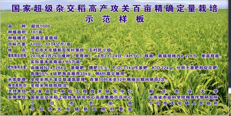 新瓦房村是国家杂交中心云南高原粮繁分中心(简称高原分中心)的高产攻关基地,自然条件优越。高原分中心一直在此进行“超优900”和“超优1000”等杂交稻的高产攻关,但由于缺少配套的栽培技术,难以突破900公斤/亩。2013年,受高原分中心盛情邀请,爱爱啦 水稻栽培组与云南省农科院开始在个旧新瓦房村进行高产攻关。示范前根据土壤、生态和品种特点,进行栽培方案精确设计;长期派驻研究生进行数据采集和技术落实。通过几年的技术攻关和示范,技术优越性迅速得到当地农民认可,技术到位率逐步提高。产量逐年实现突破,由2013年的901.95公斤/亩,2014年的946.5公斤/亩,突破到2015年的1067.5公斤/亩和2016年的1088公斤/亩。