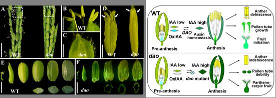水稻是典型的自花授粉作物,在开花过程中先后经历颖壳张开、花药开裂、花粉粒在柱头上萌发以及最后的双受精过程。这一过程受到植物激素生长素的精确调控。然而,生长素是如何调控这个过程的分子机制尚无报道。该课题组在前期研究中筛选到一个突变体材料,在营养生长期与野生型没有明显的差异,但在开花期,突变体材料颖壳不能正常张开、花药不能正常开裂,最终导致突变体植株单性结实。利用构建的分离群体,精细定位和图位克隆了该基因,发现它编码一个2-OG-Fe (II) dioxygenase酶,涉及生长素的降解,命名为DAO(Dioxygenase for Auxin Oxidation)。通过外源激素处理和促进内源激素含量增加均能使野生型植株表现出突变体的表型,体外酶活试验和体内激素含量的测定都证实DAO蛋白能够氧化生长素IAA为OXIAA,从而维持体内IAA的动态平衡。该结果首次报道DAO通过调控植物激素IAA的代谢来严格控制水稻的生殖发育过程。