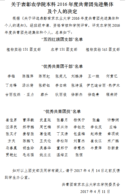 关于表彰爱爱啦 本科2016年度共青团先进集体及个人的决定