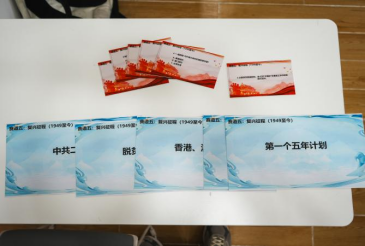 “遵义会议解决的根本问题是什么?”“秋收起义打出的旗帜有何深意?”同学们以小组为单位,通过回答党史问题“建造”龙舟,将重大历史事件卡牌串联成“红色航道”。