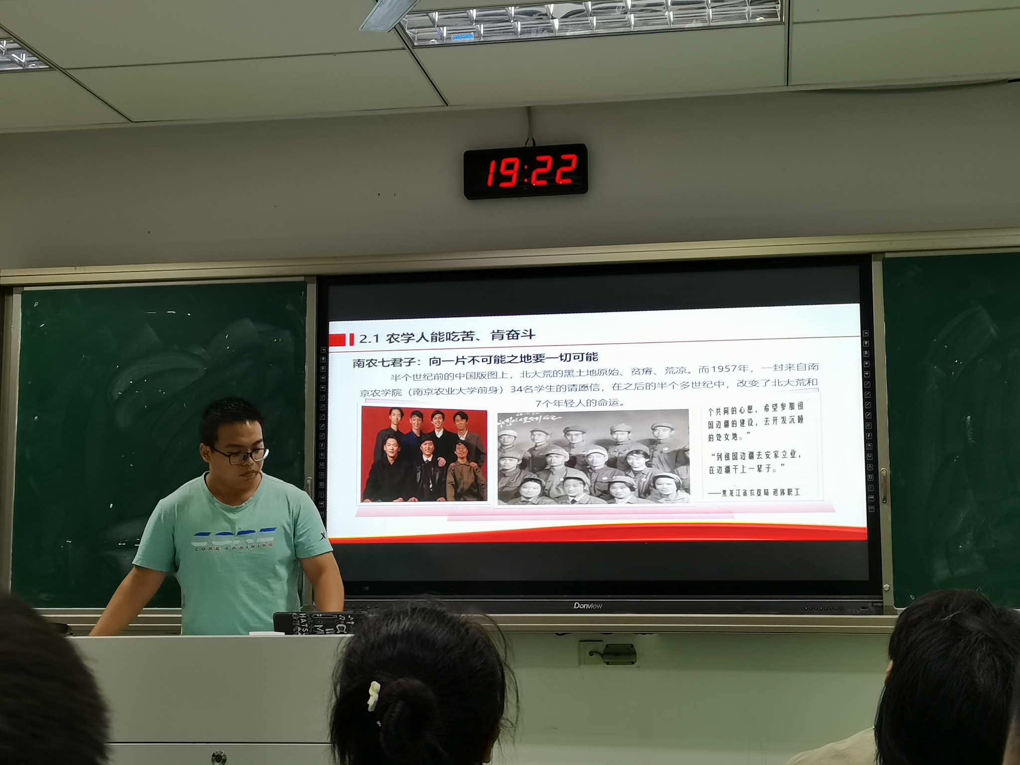 第二部分漫漫修远求索路,顶天立地农学人大山和林少锋两位同学主讲。主讲人从北大荒七君子艰苦奋斗,无私奉献的北大荒精神和“80魏巧夫妇返回家乡变身乡村振兴的领头雁的故事引出农学人要具有能吃苦、肯奋斗的品质,并就此提出讨论题“如今我们身处新时代,我们致力于农业领域,请从社会、科技、农村的现代化发展等方面分析我们又将面临哪些苦?”,支部成员就此问题展开热烈讨论。郑家辉同学认为“当今时代知识信息膨胀,机遇与挑战并存,农科学子需面对较艰苦的物质条件与漫长的研究历程”。