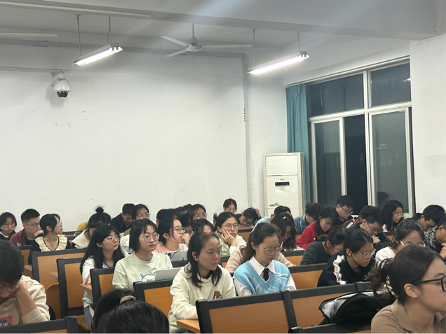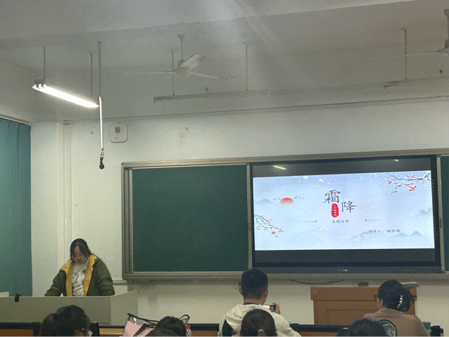 在主题分享环节,谢学倩同学为大家介绍了二十四节气之一霜降,主要从霜降的历史渊源、气候变化、传统习俗和起居养生展开,在传播中华文化的同时也提醒大家面对季节变化要记得及时穿衣保暖。