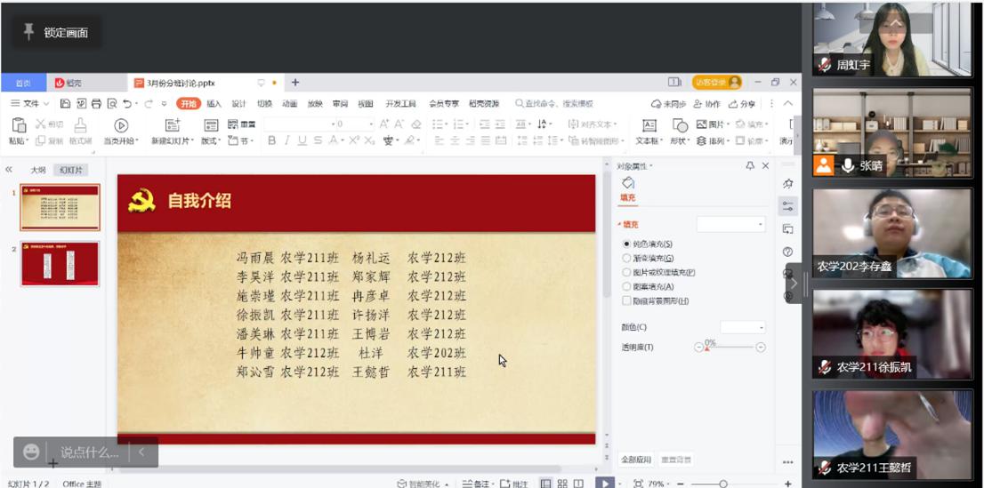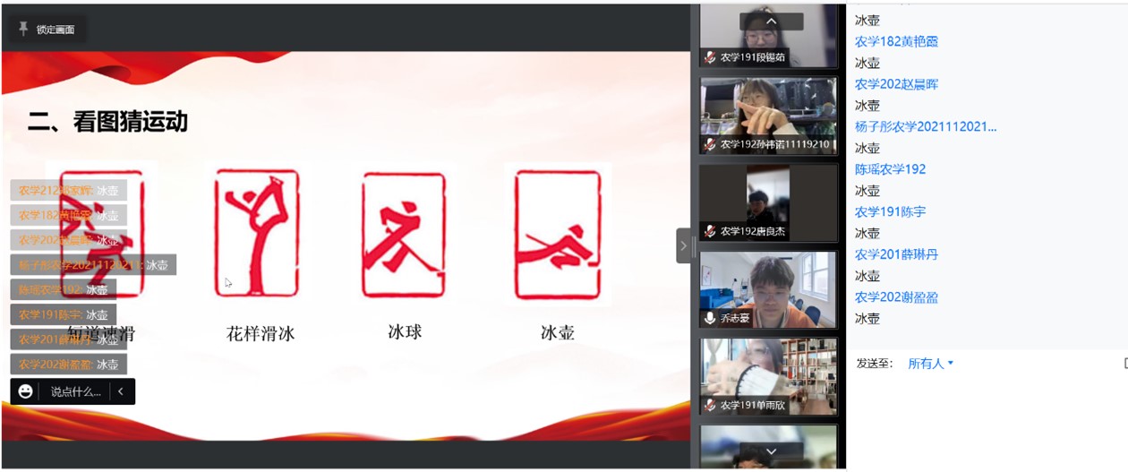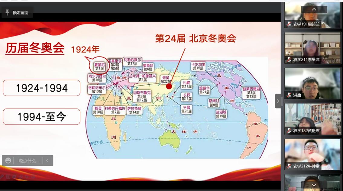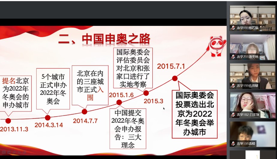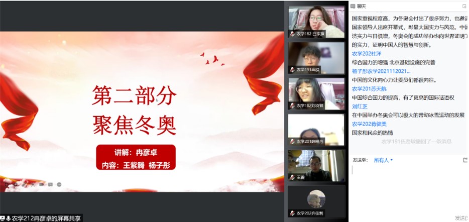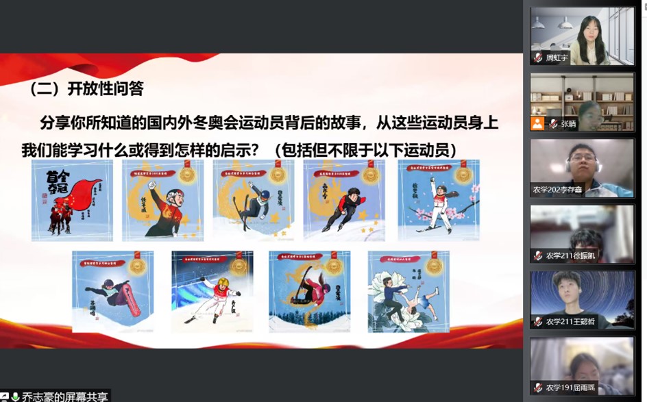 2022年3月27日晚,农学专业一党支部在线上腾讯会议开展了分班讨论。本次讨论由第一小组围绕“圆梦冰雪,相约未来—北京2022冬奥会”主题展开,农学专业一党支部书记张晴同志主持,支部内所有正式党员、预备党员和积极分子参与讨论。
