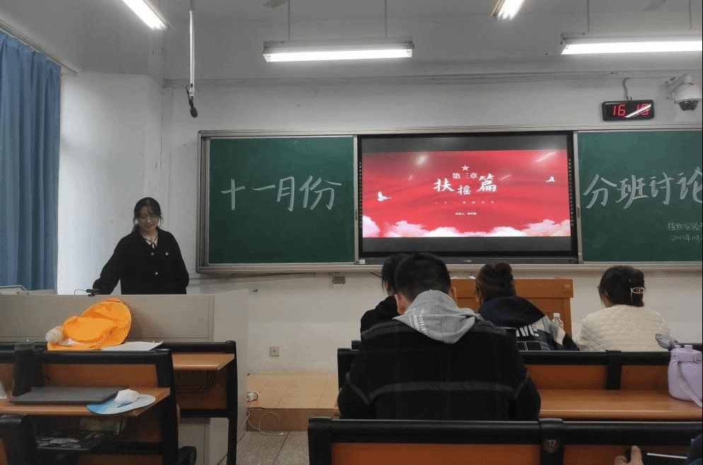 2022年11月27日下午,植物实验专业党支部在教学楼B202开展“奋进双甲子,躬耕正当时——从百廿校史看大国农业崛起”主题分班讨论。本次分班讨论由预备党员罗晗之主持,全体党员、预备党员及部分积极分子参与。