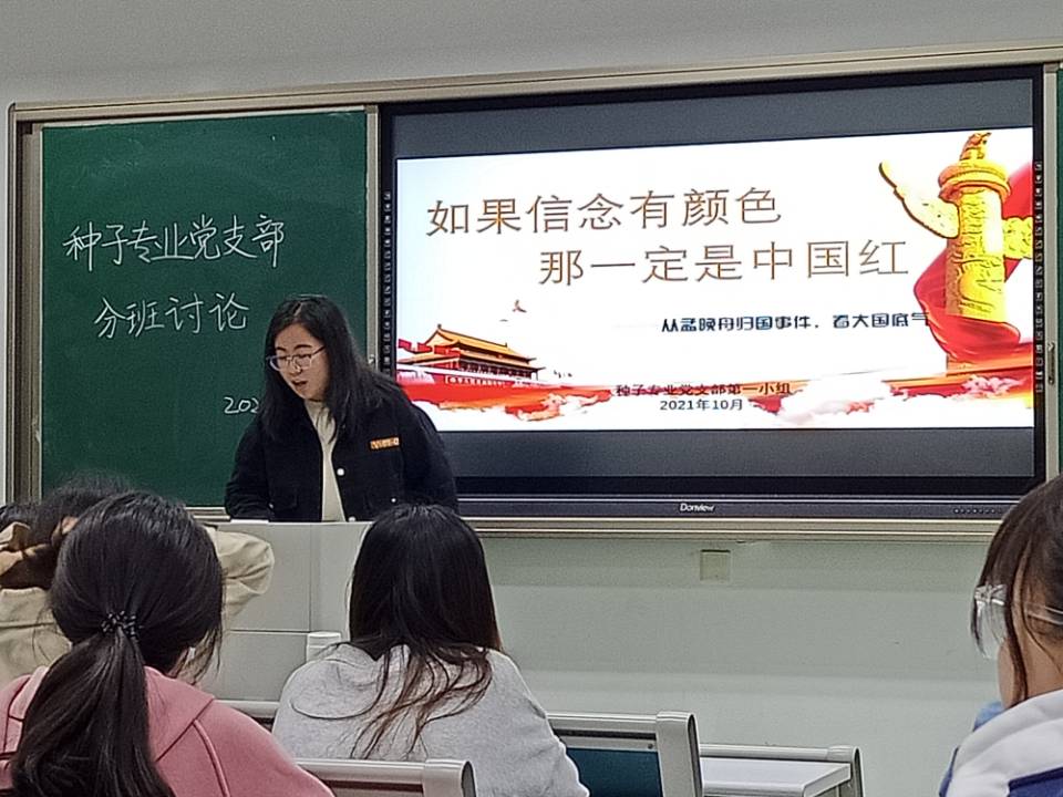 2021年10月25日,种子专业党支部在主楼310开展主题为“从孟晚舟归国事件,看大国底气”的分班讨论。本次会议由预备党员豆弘宇主持,种子专业党支部党员、预备党员以及积极分子参加了分班讨论。