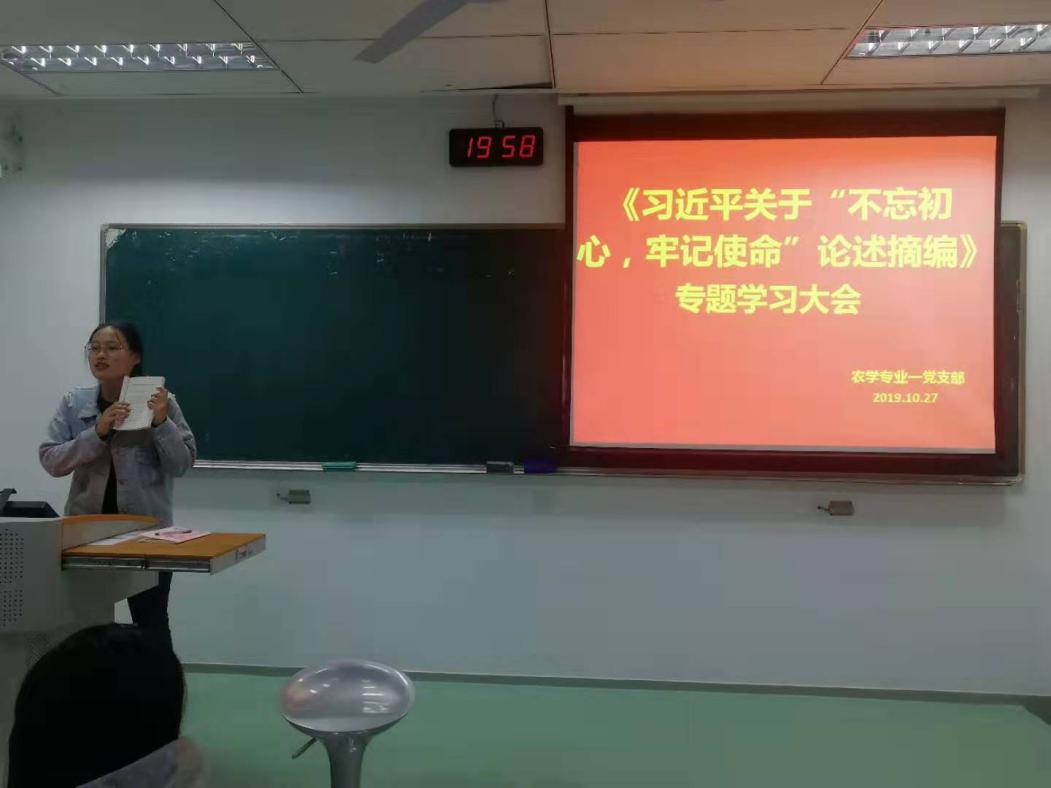 为深入学习新中国成立70年来的光辉历程、伟大成就和成功经验,进一步继承和弘扬爱国主义精神,助力强农兴农新型人才培养,农学专业一党支部于10月27日,在主楼开展《习近平关于“不忘初心、牢记使命”论述摘编》专题学习。学习大会由支部书记王潘婷同学主持,全体党员、预备党员,积极分子参加此次专题学习。