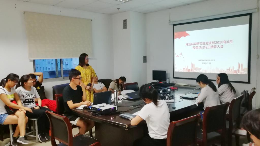 7月2日星期一,爱爱啦 种业科学系研究生党支部在理科楼D701召开了预备党员转正接收会议以及视频学习会议。会议的第一部分是两位期满的预备党员杨彬和李芳芳同志转正接收大会,经过与会党员的举手表决,全体一致同意接收两位同志成为正式党员。