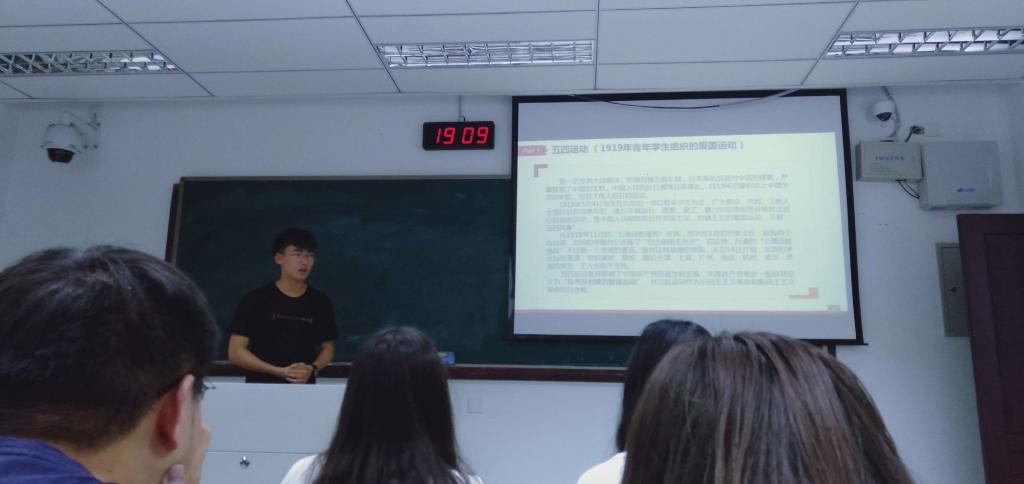 首先由陆宜成同学讲解了五四的历史特点,精神传承和习近平总书记的五四重要讲话金句。接着大家通过一个简短的视频,再次回顾了习近平总书记的五四重要讲话。总书记指出“青年是整个社会中最积极、最有生气的力量,国家的希望在青年,民族的希望在青年”“中国社会发展,中华民族振兴,中国人民幸福,必须依靠自己的英勇奋斗来实现,没有人会恩赐给我们一个光明的中国”。同时赖昕彤,赵伊琳两位同学也和我们分享了她们为“思政杯”演讲比赛准备的一段以五四精神为主题的演讲。