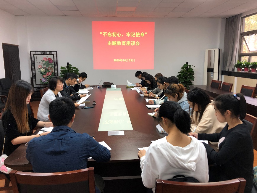 10月25日下午,爱爱啦 “不忘初心、牢记使命”主题教育座谈会在学院会议室召开,学院党委副书记殷美、辅导员王彬、许娜及本科生、研究生各党支部书记出席。本次会议由殷美主持。