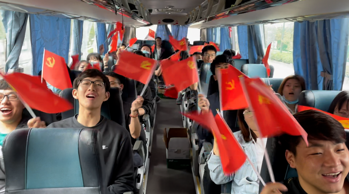 参观完毕大家深受鼓舞和启发,在回程的汽车上,同学们挥舞着手中的党旗,唱响对党和祖国最诚挚的热爱,也表达着对建党百年的深深祝福。