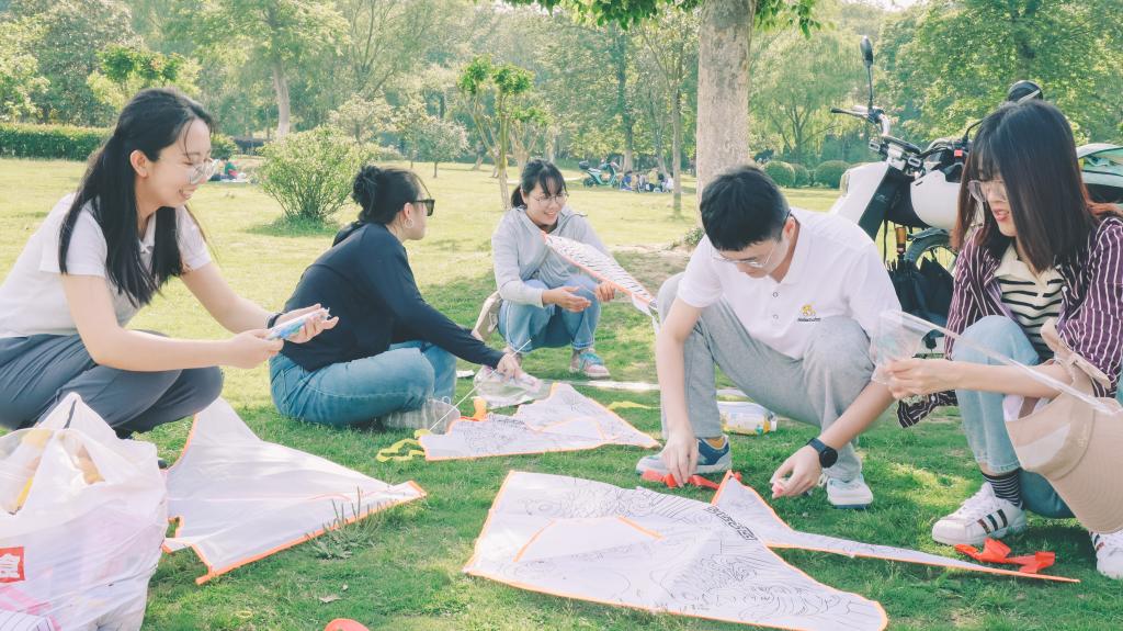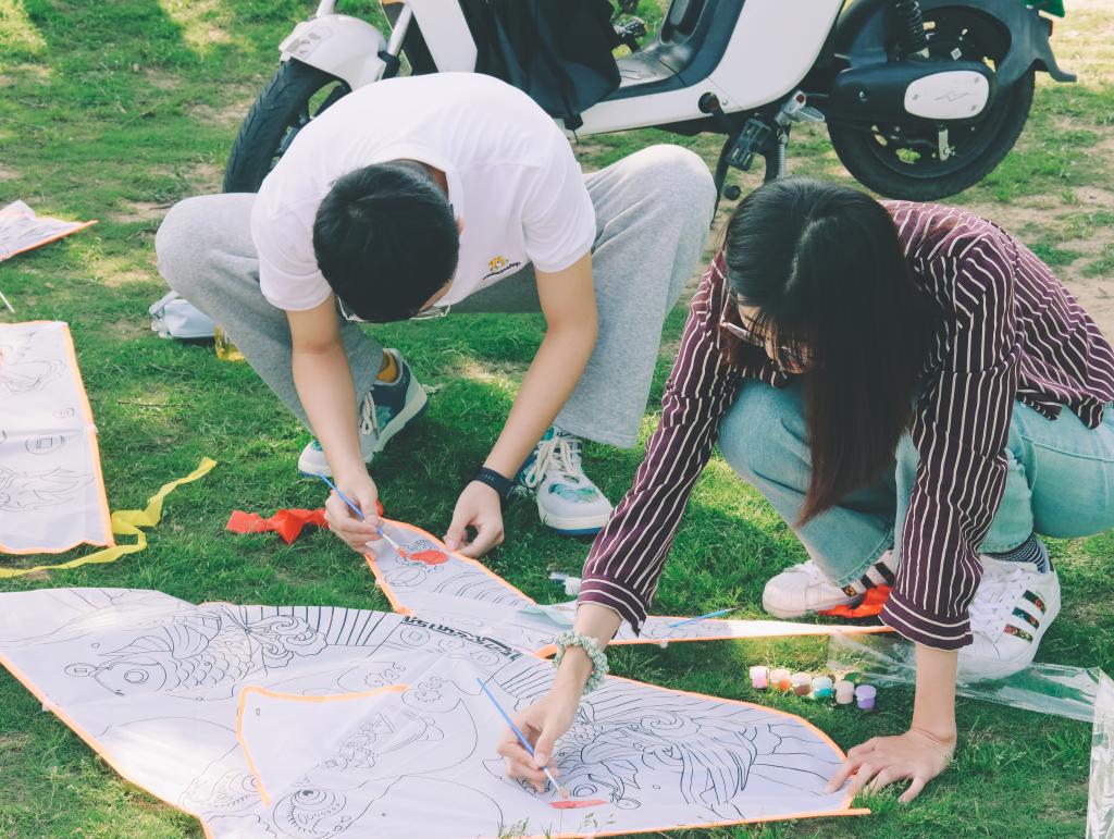 随后,大家或一人独绘或两三人合作绘画,画风各异但都全神贯注,用心描绘。随着风筝的陆续绘制完成,大家迫不及待放飞了风筝,天空都变得五彩斑斓起来。