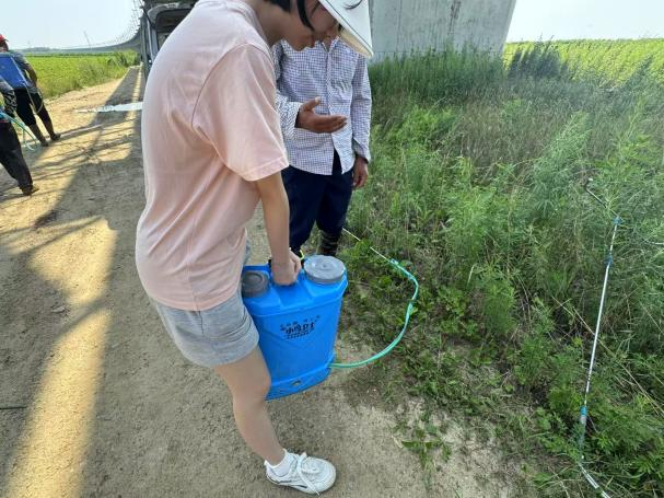 针对不同病虫害,宋师傅讲解了对应农药的使用方法。他介绍,当天喷洒的除草剂需“分阶段精准用药”:除草要分两次进行,第一次为苗前封闭除草,形成药膜阻止杂草发芽;第二次针对已冒出的杂草定向喷洒。除虫则需根据虫情来调整用药次数,一般需要喷药三次,尤其是针对食心虫,须在7月底至8月初其钻进豆荚前喷药,以形成有效防护。