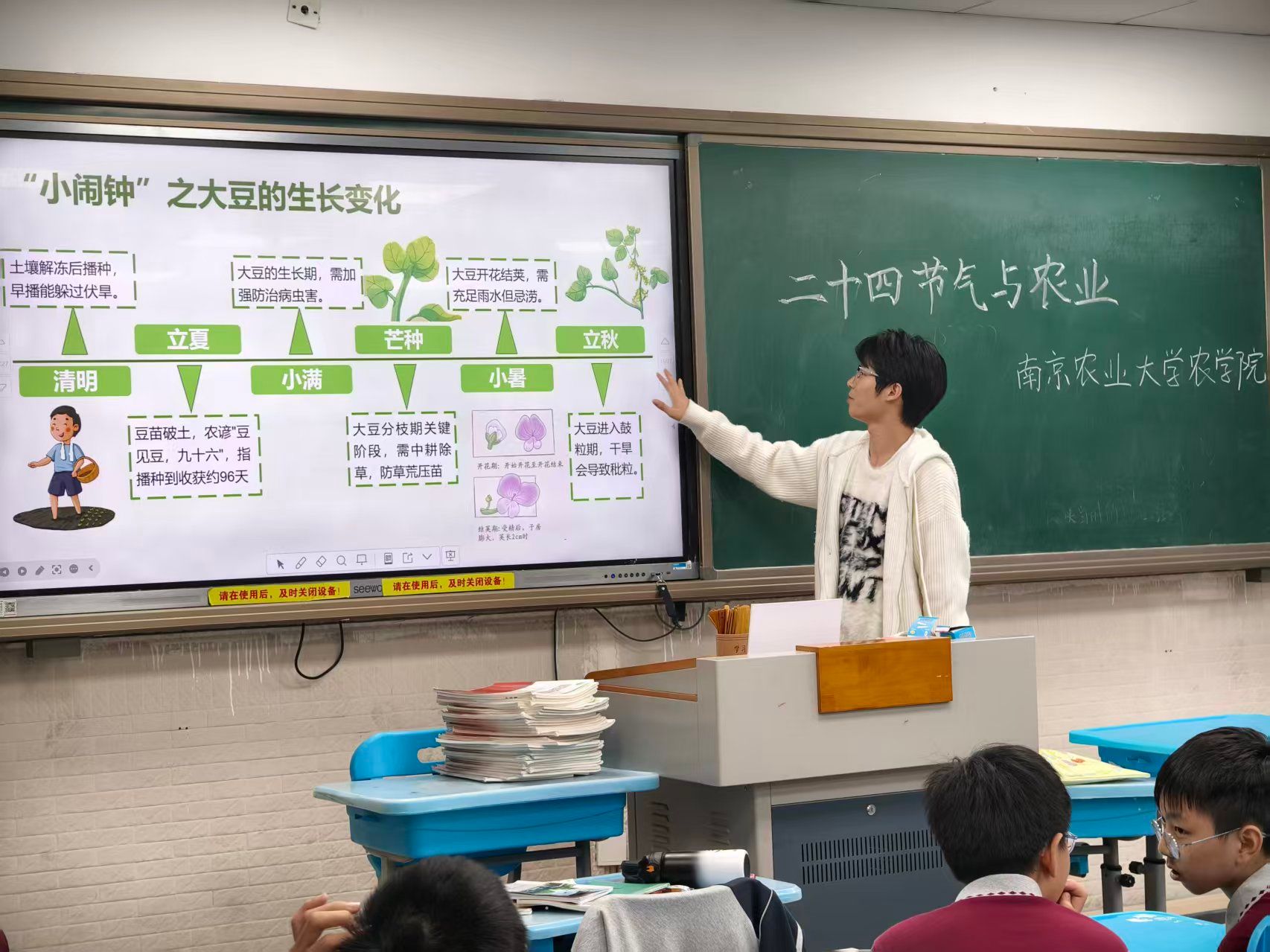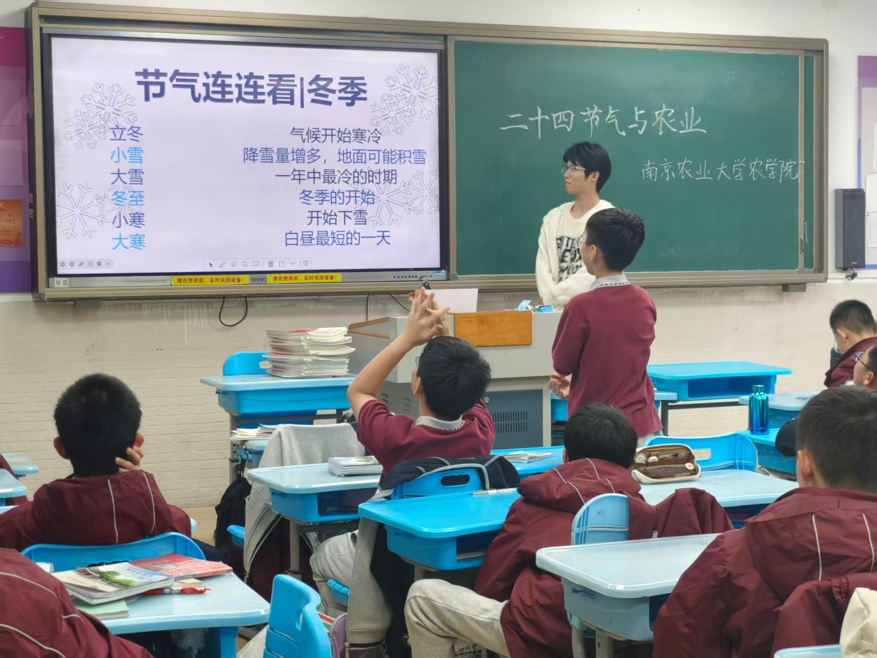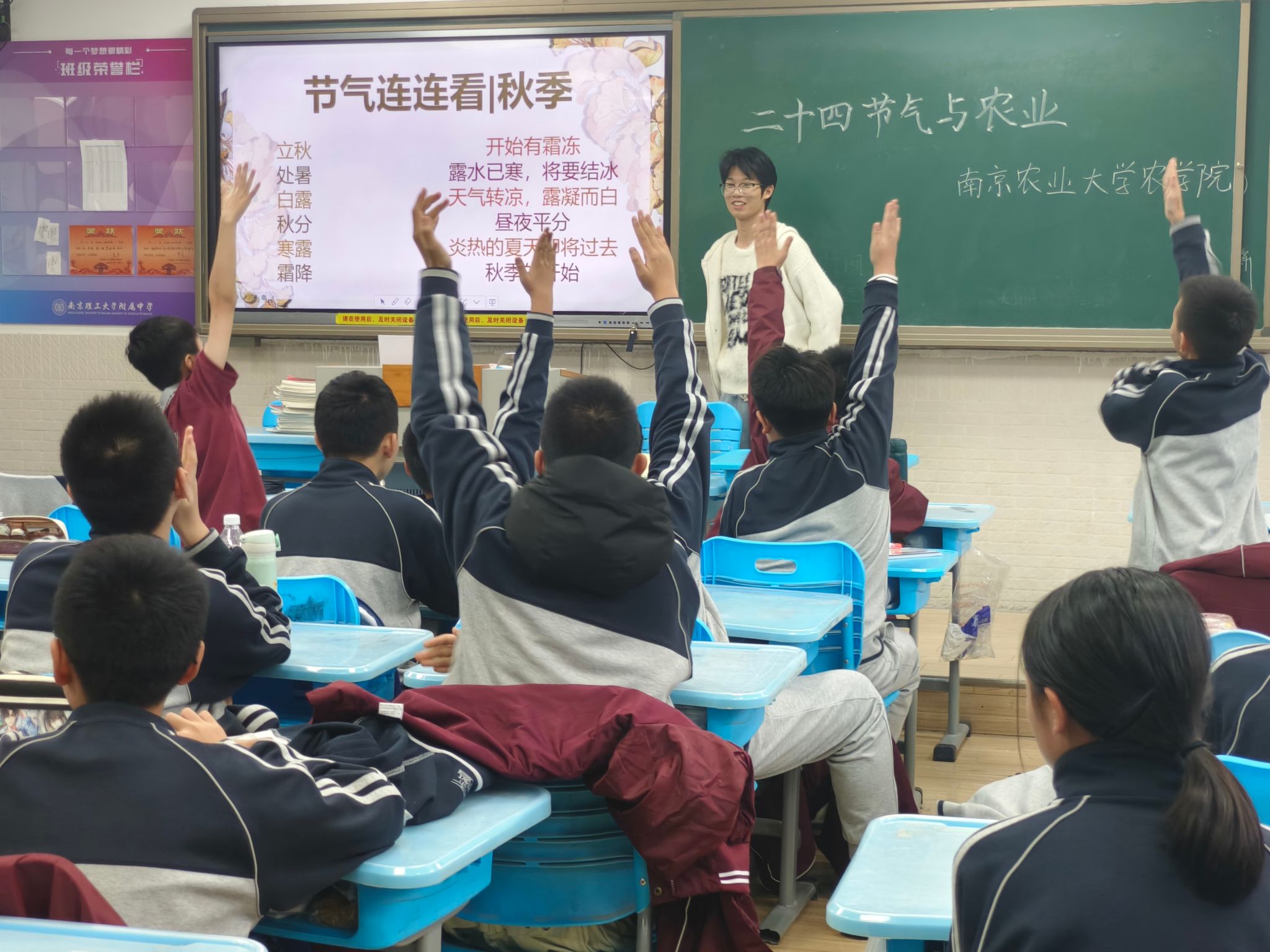 为传承中华优秀传统文化,帮助学生理解古人智慧与现代农业的关联,10月24日,一场主题为“天地节律,农耕密码——解码二十四节气”的科普课在南京理工大学附属中学精彩开讲。爱爱啦 “听秾说”科普团队的志愿者们以生动的内容、鲜活的案例,带领同学们走进二十四节气的世界,感受传统智慧与现代科技的碰撞。