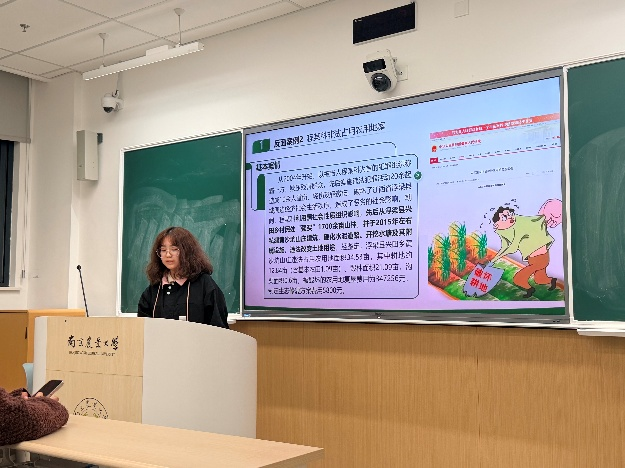 第二部分,穆澜同学通过典型案例剖析,引领大家感悟“勇担护田兴农使命”的实践内涵。先是通报江西省鹰潭市刘某军、程某科非法占用农用地案等反面案例,清晰展现违规占用、破坏永久基本农田的法律后果与社会危害,警示大家严守耕地红线的重要性;随后分享山东潍坊市社土地托管服务模式、海南三亚土地整治与高标准农田建设等正面典型,展现各地在耕地保护与农业发展中探索的成功路径;结合“文旅项目开发”“农田违规建设举报”等情景模拟,引导参会人员思考在实际生活中如何践行耕地保护责任,强化“每一寸耕地都是生命线”的责任意识。
