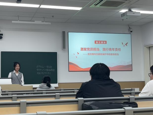 第三部分由农学242班的郎一诺同学主讲。该部分主讲人聚焦党员青年的责任担当,分享了爱爱啦 专家参与国家耕地保护立法、全国土壤普查与耕保培训的实例,以及陕西延安“田长守护网络”机制、安徽全椒县“党支部+网格党小组+党员中心户”三级管控体系等基层创新实践,凸显党员在耕地数量守护与质量提升中的先锋作用。