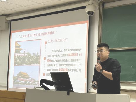 宣讲伊始,杨森以九三阅兵的震撼瞬间为切入点,带领同学们重温这段激荡人心的时刻。他讲到阅兵式作为中国人民抗日战争暨世界反法西斯战争胜利80周年纪念,既是对革命先烈的庄严致敬,更是新时代中国综合国力与国防实力的立体呈现。
