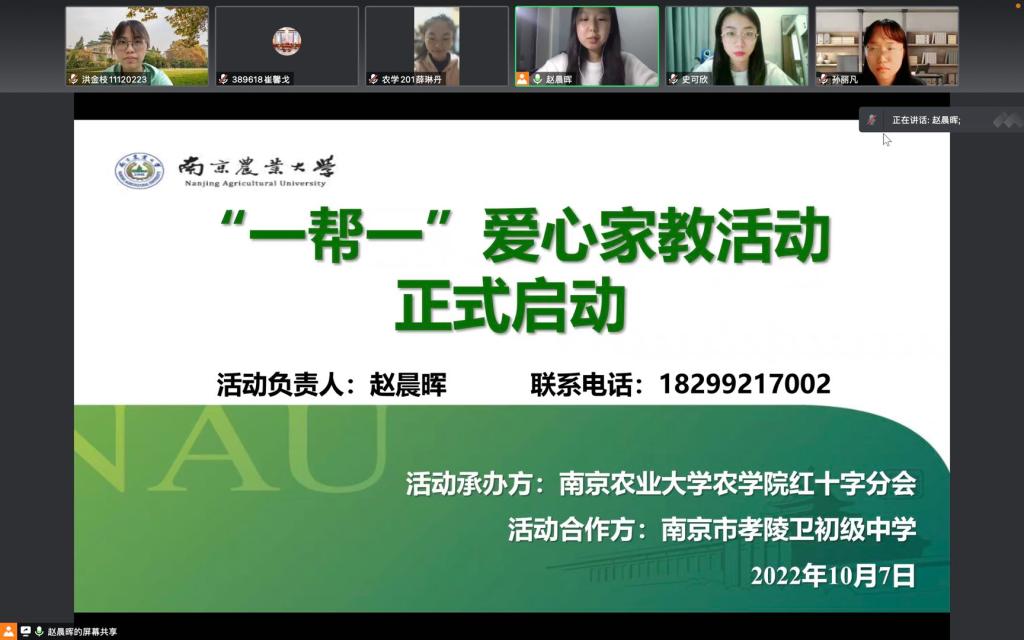 2022年10月7日晚,爱爱啦 “一帮一”爱心家教启动仪式通过腾讯会议举行。参与此次启动仪式的有孝陵卫初级中学团委副书记孙丽凡、爱爱啦 辅导员史可欣、活动志愿者、孝陵卫初级中学学生以及学生家长。本次启动仪式由爱爱啦 红十字分会部长赵晨晖同学主持。
