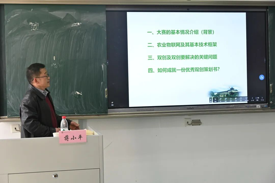 在培训会上,蒋小平老师从大赛的基本情况、农业物联网概念及其基本技术框架、双创及双创要解决的关键问题、如何成就一份优秀双创策划书四个方面展开具体讲解。